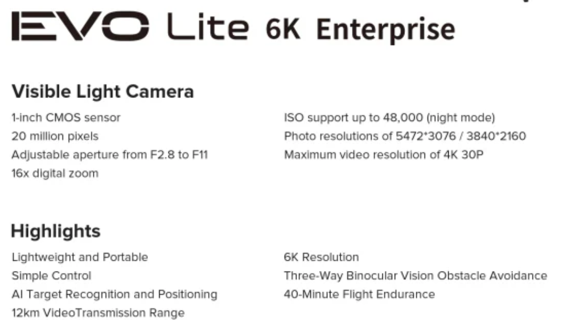 EVO Lite Enterprise Series, by Autel Robotics, is characterized by its lightweight and compact design, making it remarkably portable. The A-Mesh networking capability supports collaborative dual-drone dual-control operations. Equipped with high-precision visual navigation capabilities, it supports stable flight even in environments with poor signal through SLAM technology. The EVO Lite 6K is equipped with a 1-inch CMOS visible light camera, offering outstanding sensitivity for excellent image quality.