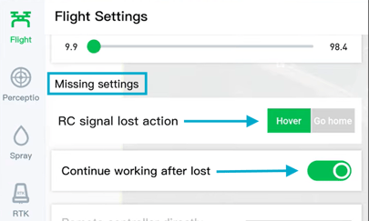 - If in a current mission, you can select to continue working after the signal is lost, or turn it off, and the drone will do whatever was selected above (Hover or Go Home). If this is turned on, the drone will continue with the mission and then (Hover, or Go Home) depending on what you selected.