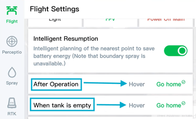 - You can now choose what the drone does after operation (Hover, or Go Home) and what the drone does when the tank is empty (Hover, or Go Home).