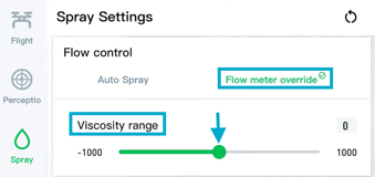 - Select 'Flow meter override' to override the flow meter and adjust the 'viscosity range', which adjusts the RPMs of the pumps. (This is very useful because even if you have a faulty flow meter, you can still run your spray operations by overriding it.)