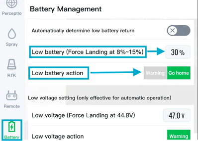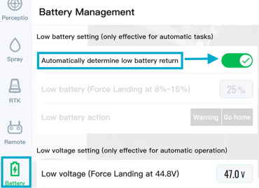 - If 'automatically determined low battery return' is toggled ON, it will take into account battery percentage, distance from home point, and weight/tank fullness to get the drone back to the home point and land around 20% battery life. (Example: If you are a half mile away from home point with 40% battery and a half full tank, it may start the return to home flight). It is recommended to keep this on for most operations.