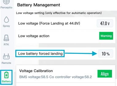 - Low Battery Forced Landing, you can adjust this between 5-15% and the drone will automatically start to land where the drone is when the selected percentage is reached.
